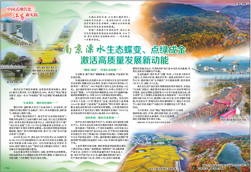 Lishui District is located in the south of Nanjing, which is the source of the 100-mile Qinhuai River, has 101 small and medium-sized reservoirs, and has a forest coverage of 36%. Lishui, guided by the concept of "two mountains", has come out with a high-quality development road from "environmental improvement" to "ecological value-added".