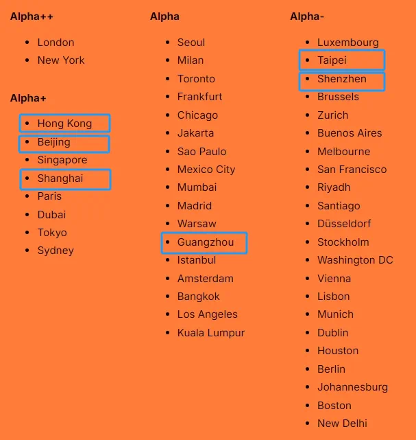 - 中國臺北、深圳為Alpha-(世界一線弱城市)。