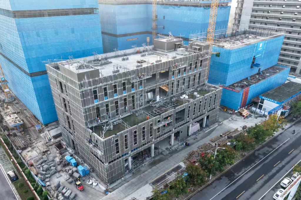 目前,1號樓和2號樓已經封頂,1號樓進入外立面幕墻施工;3號樓和5號樓正在進行屋面施工,即將封頂;4號樓正在進行消防水池施工,計劃11月底封頂。建成后將為集成電路及相關企業提供生產、研發、倉儲等一體化配套空間,助力新區產業集聚發展。