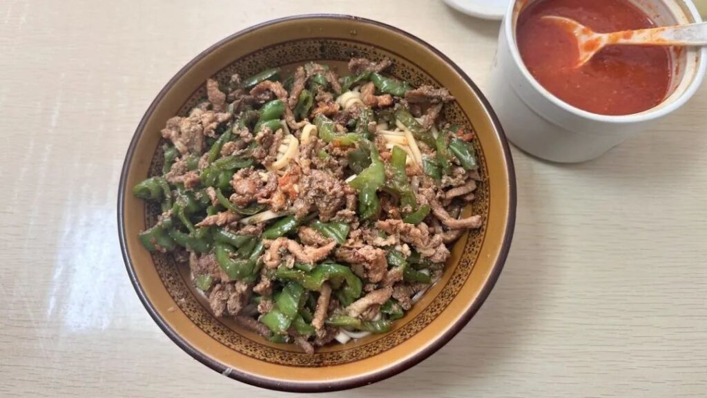 面條較寬且薄,吃起來滑爽又有嚼勁,配以滾燙的紅湯和新鮮制作的澆頭,咸鮮味濃厚,令人回味無窮。“從小吃到大的味道一直沒變,基本上每周都會回來吃上一碗。”李先生說。