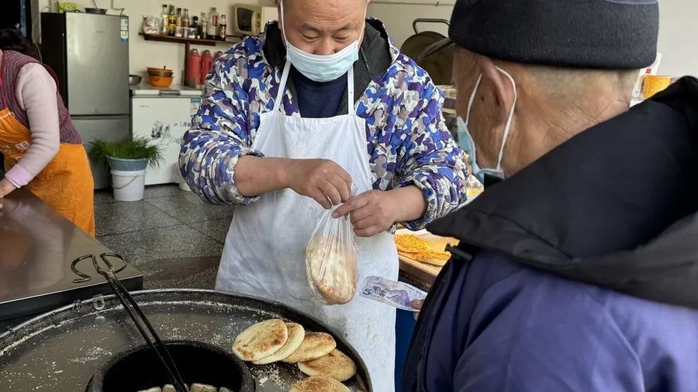 再往里走,興旺燒餅店的燒餅也深受附近居民的喜愛。每天早上5點多,濃濃的燒餅香從這里飄散開來,夫妻倆一個揉面捏餅,一個看爐烤餅。燒餅甜咸兩種口味,撒滿了芝麻,面香濃郁,酥脆無比。