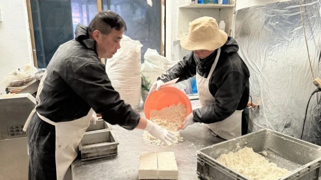 提及這條老街里的老店,洪藍商業(yè)食品廠必須榜上有名。廠里生產的洪藍玉帶糕是溧水人家喻戶曉的傳統(tǒng)特產,擦糕、蒸制、切糕……老板嚴先生在這里經營了30多年。歲月流轉、人來人往、煙火喧囂,大家熟悉的玉帶糕,口感依然綿柔香甜,那是記憶中的味道。