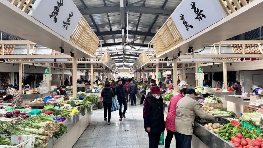 走進農貿市場,蔬菜、肉類、水產等攤區(qū)域整齊排列,魚蝦、干貨、雜糧、小百貨等應有盡有。買菜的居民左挑右選,攤主們稱重、打包,忙得不亦樂乎。