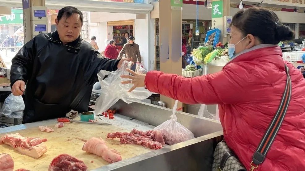 除了老街上的美食商鋪,洪藍農貿市場里也是熱鬧不已,剁肉、叫賣、討價聲此起彼伏。