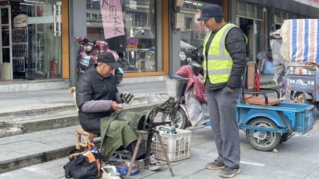 裁縫店、修鞋鋪……在老街里,一些老手藝人用匠心和巧手挽留著時光。一臺補鞋機、一個工具箱,箱子里面擺放著繩線、鞋膠、釘子等物件,是修鞋匠王師傅的“吃飯家伙”。72歲的他擺攤40多年,不停地為人們縫縫補補,也一并“縫補”著生活的煙火氣。